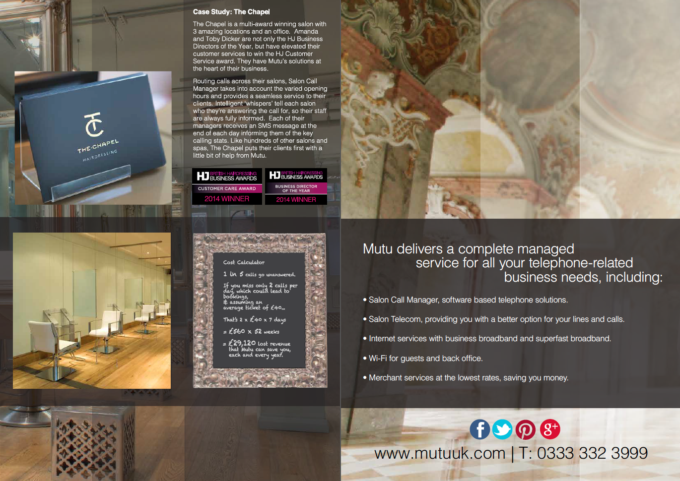 Mutu provides superb telephone and front-desk solutions to salons and spas across Europe. They needed their brand to reflect the market the lead. gb is working with Mutu across all their marketing areas, starting with this brochure.